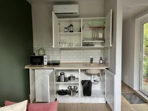 Мини-кухня: плита, микроволновка, холодильник, полный комплект посуды.