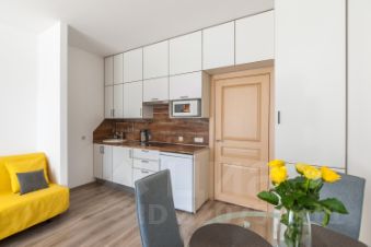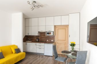 -Кухонная зона: полностью оборудованный кухонный гарнитур с электрическим чайником, микроволновкой, холодильником и всей необходимой посудой для приготовления, также обеденный стол и стулья.