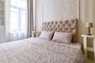 -Первая спальня, выполненная в изысканных голубых тонах, оборудована просторной кроватью размера king-sizе (160х200) с ортопедическим матрасом.