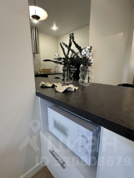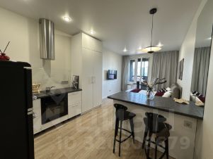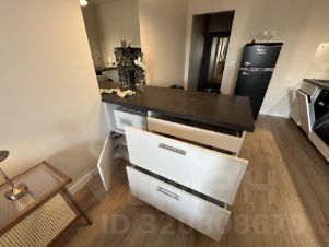 Максимально оборудованная кухня с кухонным полуостровом. Техника: холодильник, посудомоечная машина, духовой шкаф, цилиндрическая вытяжка, индукционная плита, микроволновая печь.