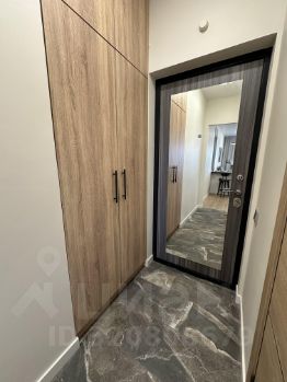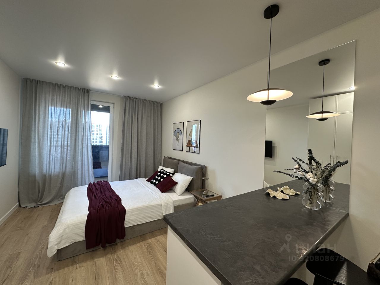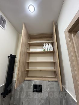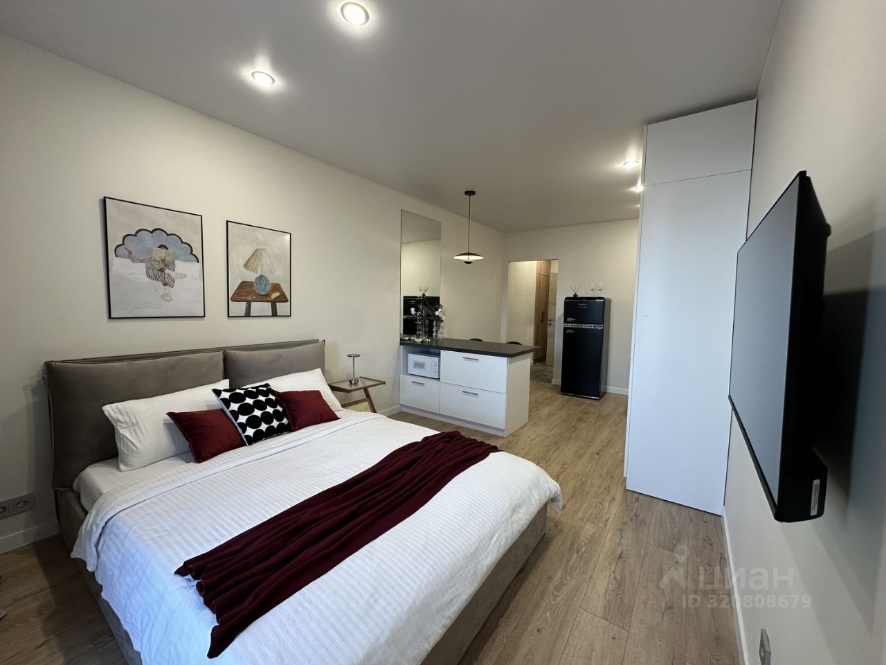 Куча мест для хранения — большие шкафы в потолок в прихожей, в комнате, в санузле, зона хранения под кроватью и в кухонном полуострове