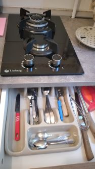 холодильник, микррволновая печь, газовая варочная панель, газовая колонка- горячая вода есть всегда, система очистки воды, посуда, приветственный кофе,чай с мятой))).