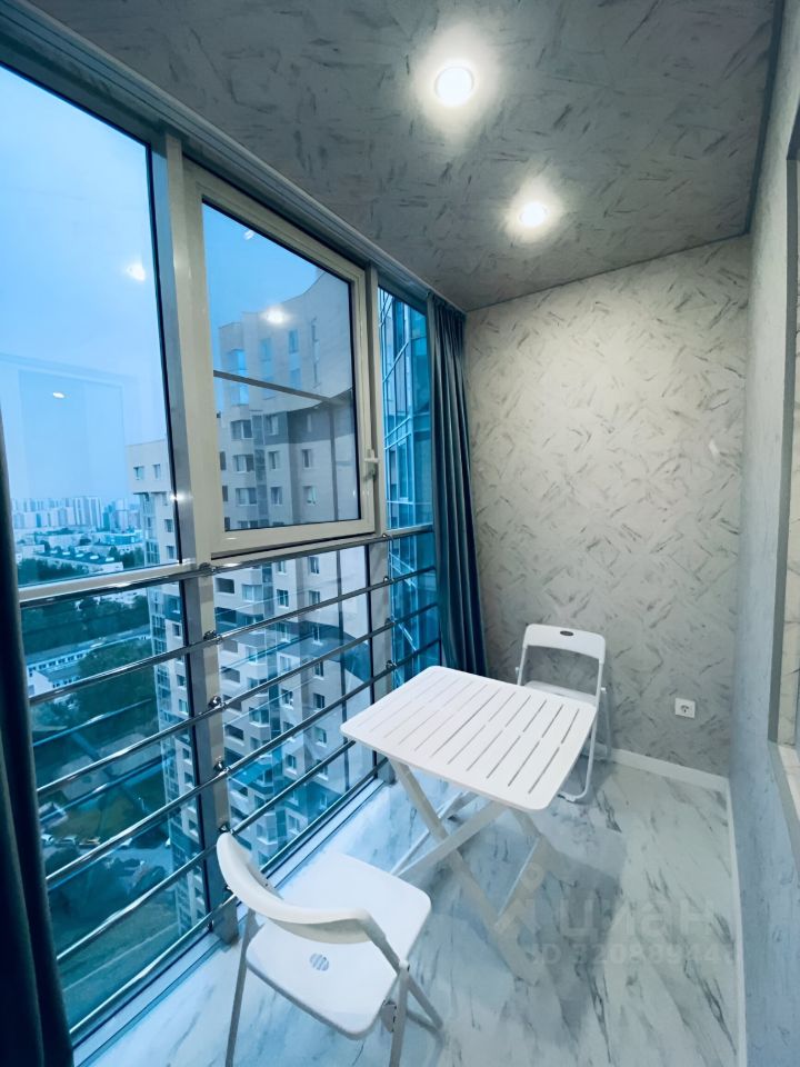 Квартира с лоджией, на которой также расположен раскладной стол и два раскладных стула.