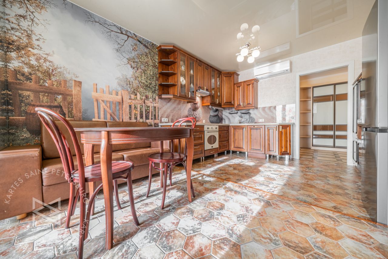 Сам дом с фасада создает ощущение надежности, безопасности и статусности, как настоящая крепость, а квартира поддерживает впечатления. В стилистике перемешаны акценты прошлого и современности, но все добротно, качественно и на века! Даже мебель, которая внешним видом напоминает советскую, на самом деле новая, сделанная на заказ из массива. Все помещения просторные, потолки 3 метра. Если коротко, то это квартира с запасом простора, прочности и комфорта!