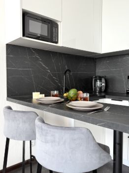 - Холодильник, микроволновая печь, чайник, капсульная кофемашина, индукционная варочная панель, набор посуды для сервировки и готовки;