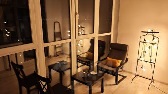 Лоджия: установлен тройной стеклопакет, пол ламинат, стулья, стол, релакс-кресло.