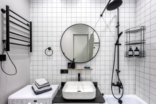 В ванной комнате: туалет, душ, стиральная машина, фен, утюг.