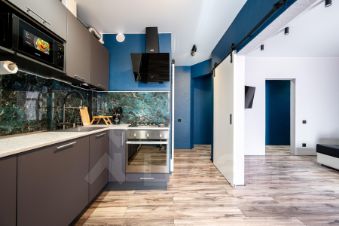 В кухонной зоне: микроволновая печь, холодильник, варочная поверхность, духовка, вытяжка, чайник, многоступенчатый фильтр для очистки воды, посуда и столовые приборы.