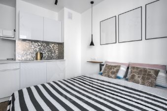 -Кухонная зона: полностью оборудованный кухонный гарнитур с электрическим чайником, микроволновкой, холодильником и всей необходимой посудой для приготовления, также обеденный стол и стулья.