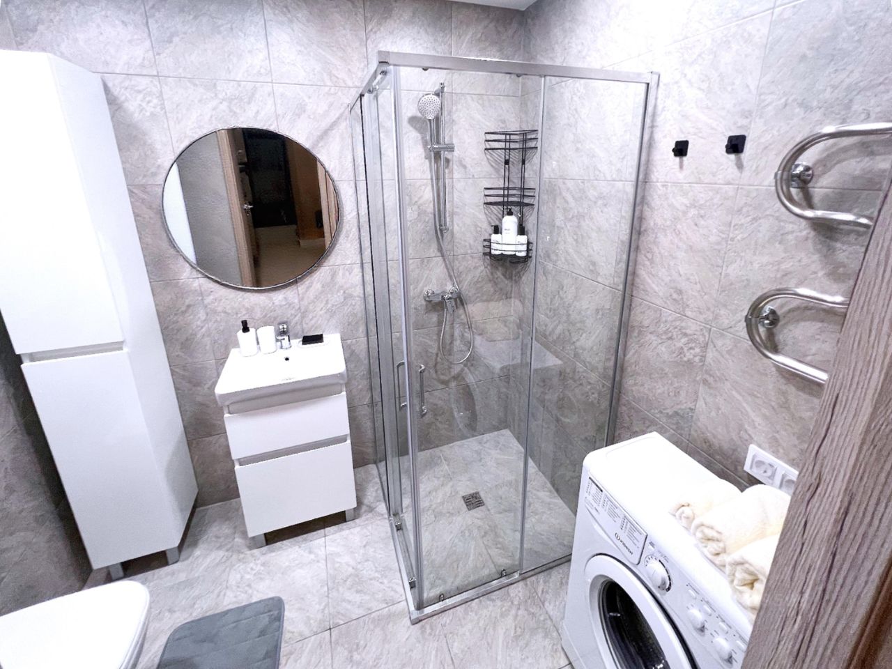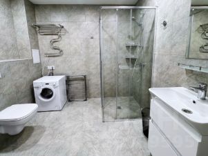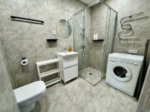 В ванной комнате: туалет, душ, стиральная машина, фен, утюг.