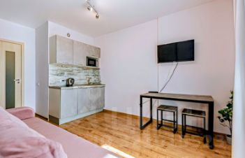 Апартамент включает: • Диван- кровать с анатомическим матрасом • Кухня с полным комплектом бытовой техники (варочная панель,холодильник с морозильной камерой,микроволновая печь, электрический чайник, посуда для приготовления пищи,столовые приборы)