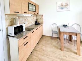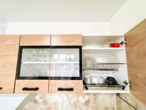 В кухонной зоне: микроволновая печь, плита, холодильник, чайник, посуда и столовые приборы на любой случай.
