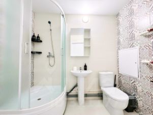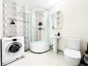 В ванной комнате: туалет, душ,фен, утюг, стиральная машина.