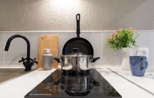 Кухня c тexникой: плита, микрoвoлновка, холодильник, чайник