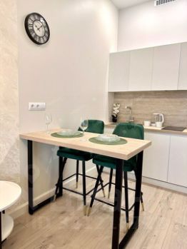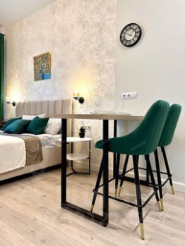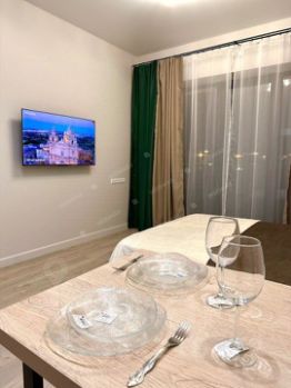 В студии выполнен качественный дизайнерский ремонт, есть вся необходимая мебель и бытовая техника, для комфортного проживания, панорамные окна, вид из окна на наб. Макарова. Отличная звукоизоляция. В жилом комплексе есть подземный паркинг. Закрытая территория, большая входная группа.