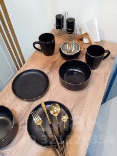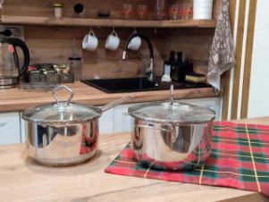 -плита, чайник, микроволновка, холодильник, сковорода, две кастрюли разного размера