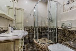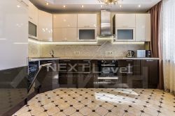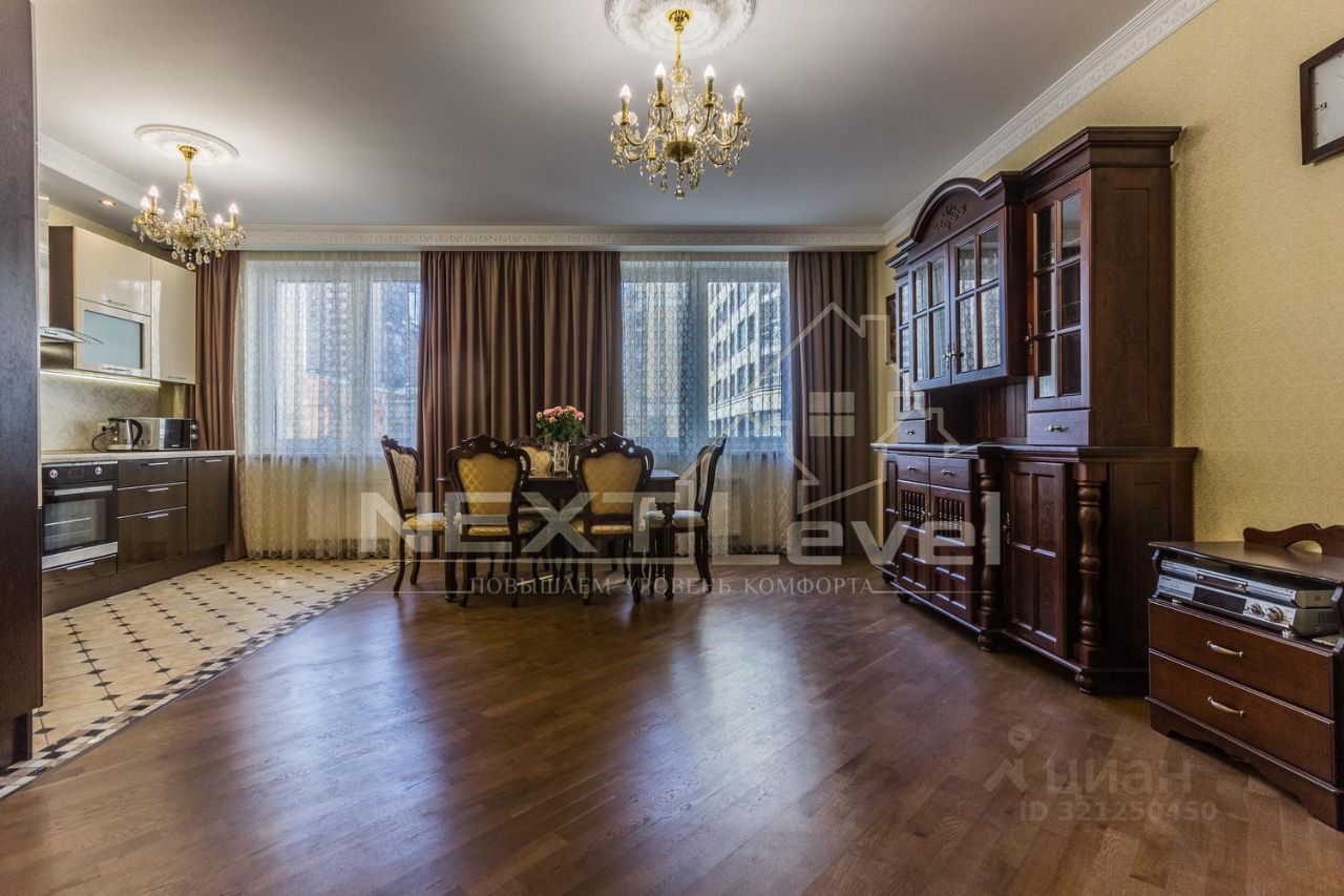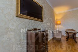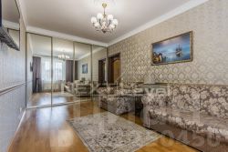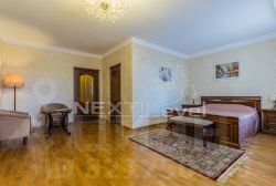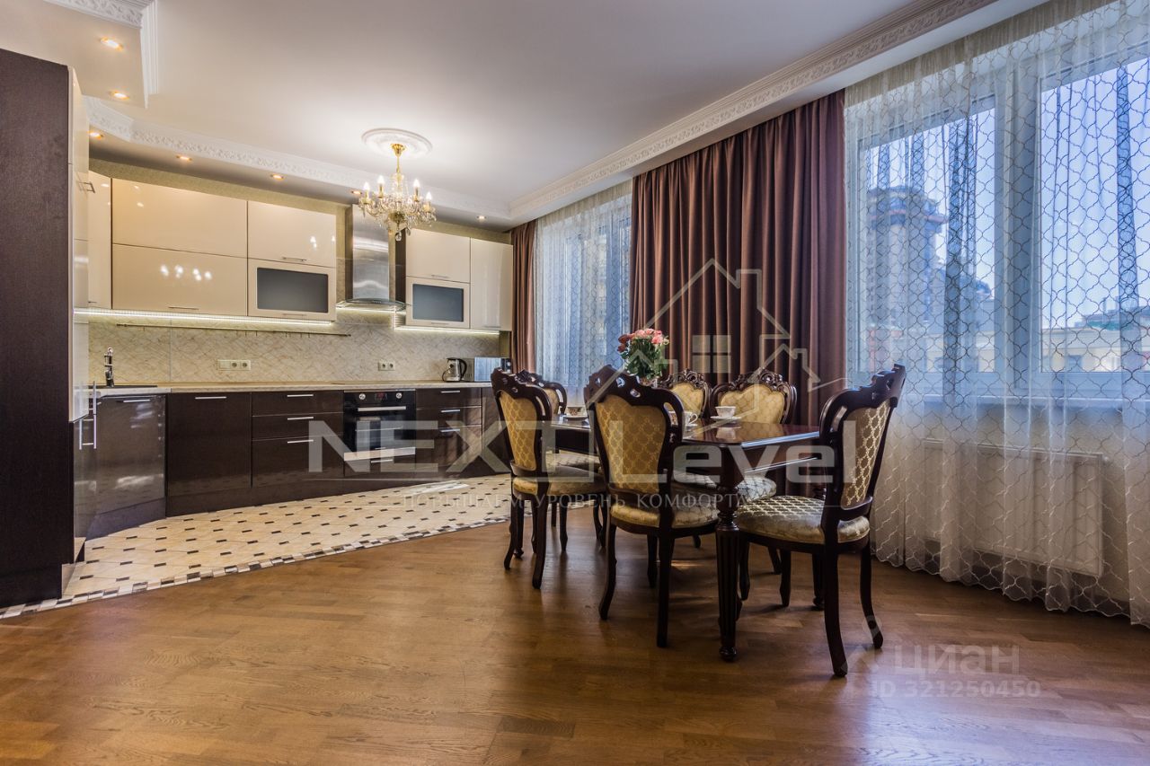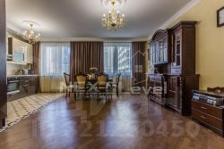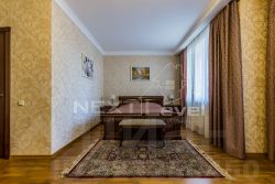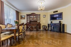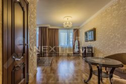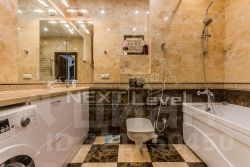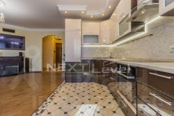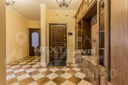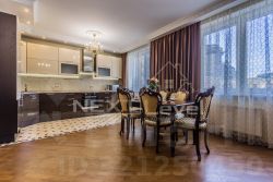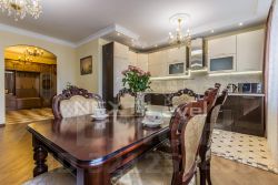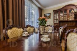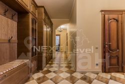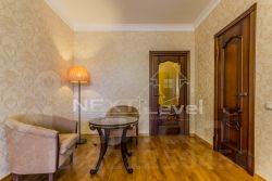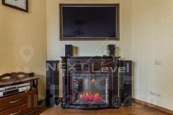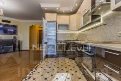 Полы в комнатах из дуба, потолок - из гипсокартона с шумоизоляцией, в санузлах установлен тёплый пол и бойлер, высота потолков 3 метра, мебель из ценных пород древесины, дорогая входная дверь, видеодомофон, электрический камин, телевизоры встроены в картинные рамки, кухня со всей необходимой встроенной техникой.