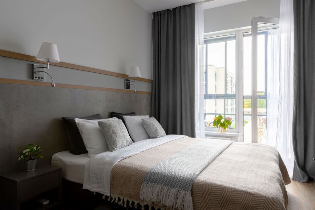 Квартира оборудована двуспальной кроватью-трансформером, которую можно разделить на два отдельных спальных места для удобства проживания.