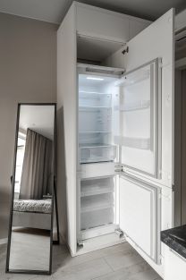 • В кухонной зоне расположились удобные велюровые стулья, вместительный полноценный встроенный холодильник с морозильной камерой