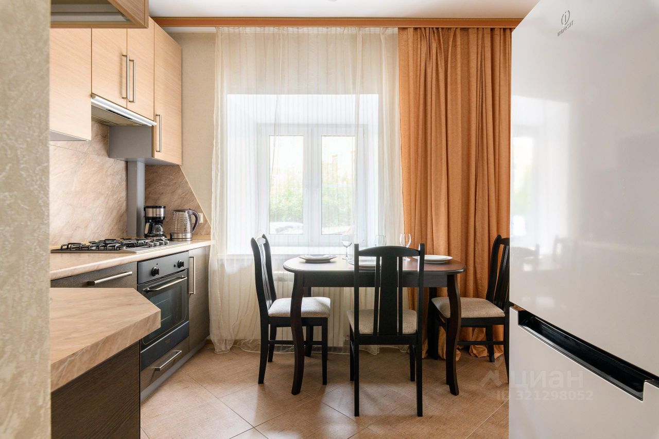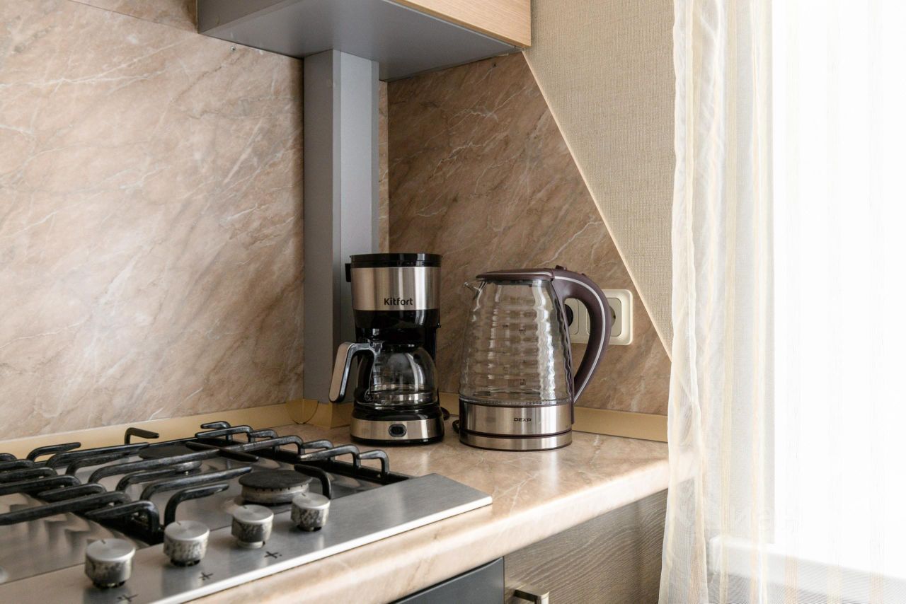 Оборудованная кухня с плитой, духовым шкафом, электрическим чайником, микроволновой печью, холодильником, посудой для приготовления пищи и сервировки стола.