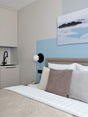 Комплекс GloraX Заневский — современный комплекс бизнес-класса с развитой инфраструктурой в 2-х минутах от станции метро Ладожская. На территории комплекса прогулочный бульвар, детская площадка, коворкинг, лаунж-зона. Интерьер в голубых, серых и древесных тонах.