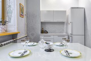 -Кухня: полностью оборудованный кухонный гарнитур с электрическим чайником, микроволновкой, холодильником, духовкой и всей необходимой посудой для приготовления, также обеденный стол и стулья.