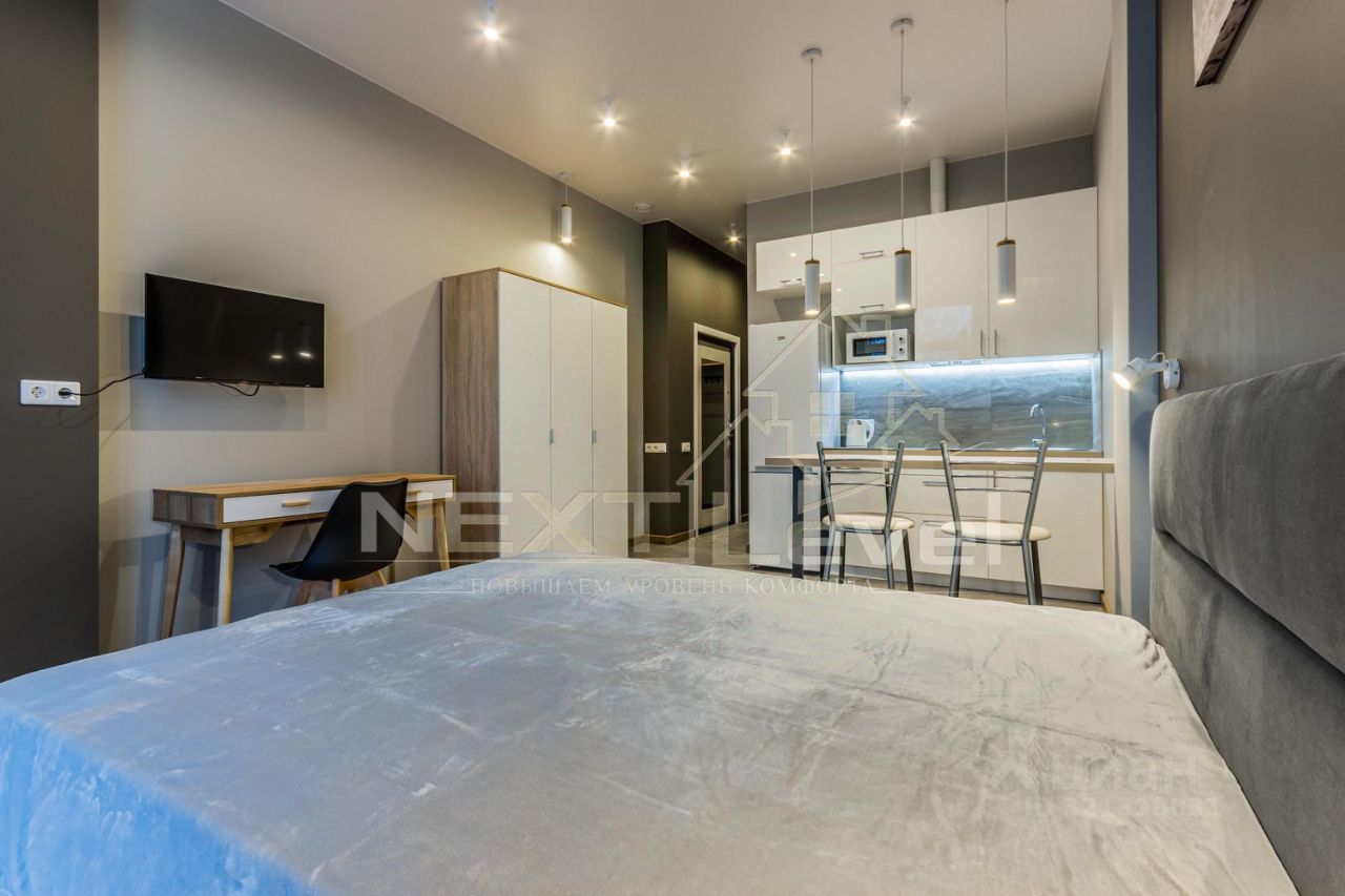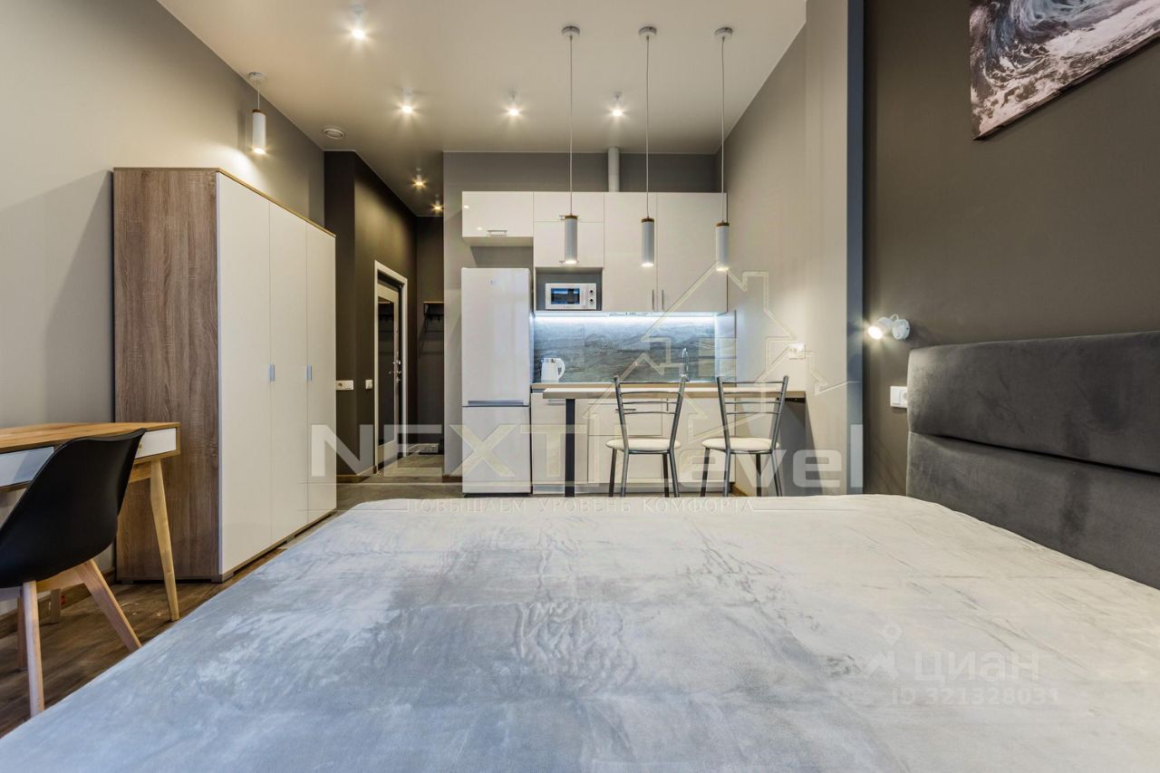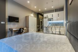 В квартире студии сделан качественный ремонт, с применением дорогостоящих материалов. Высокие потолки 3.4 метра, панорамное окно. Есть всё необходимое для комфортного проживания одного или двух человек.