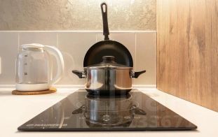 Кухня с техникой: плита, микроволновка, холодильник, чайник