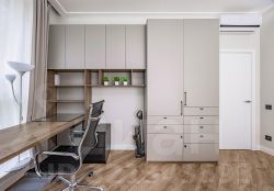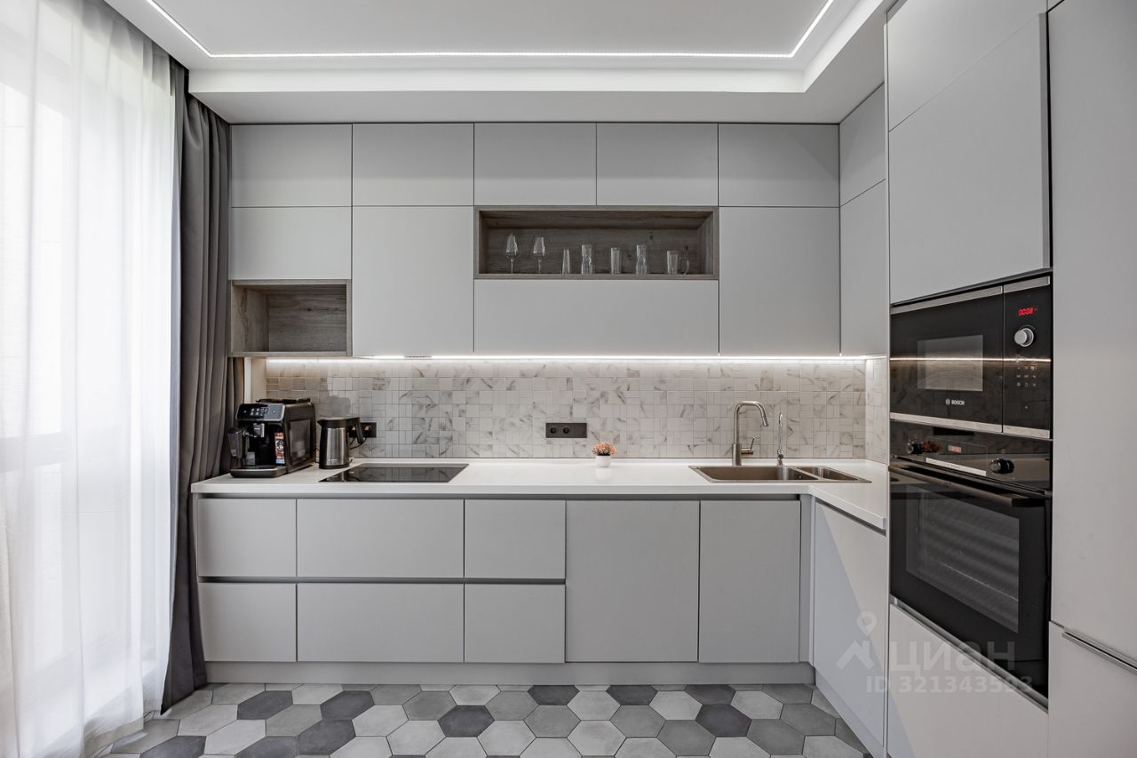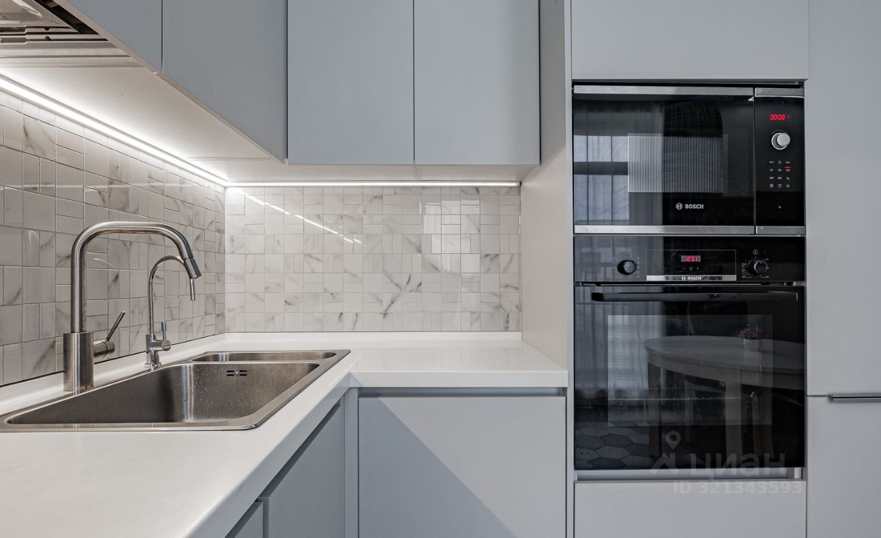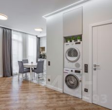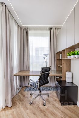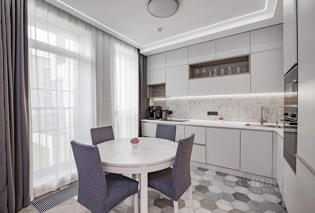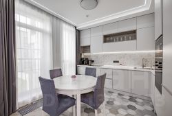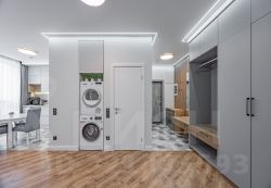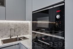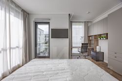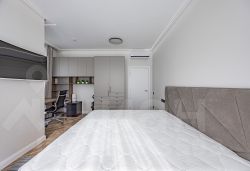 Две изолированные комнаты: спальня и детская/кабинет. Просторная светлая кухня, сделанная под заказ в потолок с премиальной встроенной техникой Bosch, Samsung, есть дополнительный раскладной диван. Спальня с большой кроватью 200х200 и качественным матрасом, а вторая комната с удобным раскладным диваном. В спальне оборудована удобная рабочая зона, по всему апартаменту несколько больших систем для хранения вещей. Два больших Smart TV Samsung, стиральная и сушильная машина Bosch.