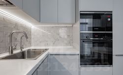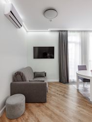 Отдельно стоит отметить наличие кондиционеров в кухне и обеих комнатах, теплого пола, оборудованного балкона с выходом из спальни и прекрасным видом во двор. В апартаменте продумана система освещения.