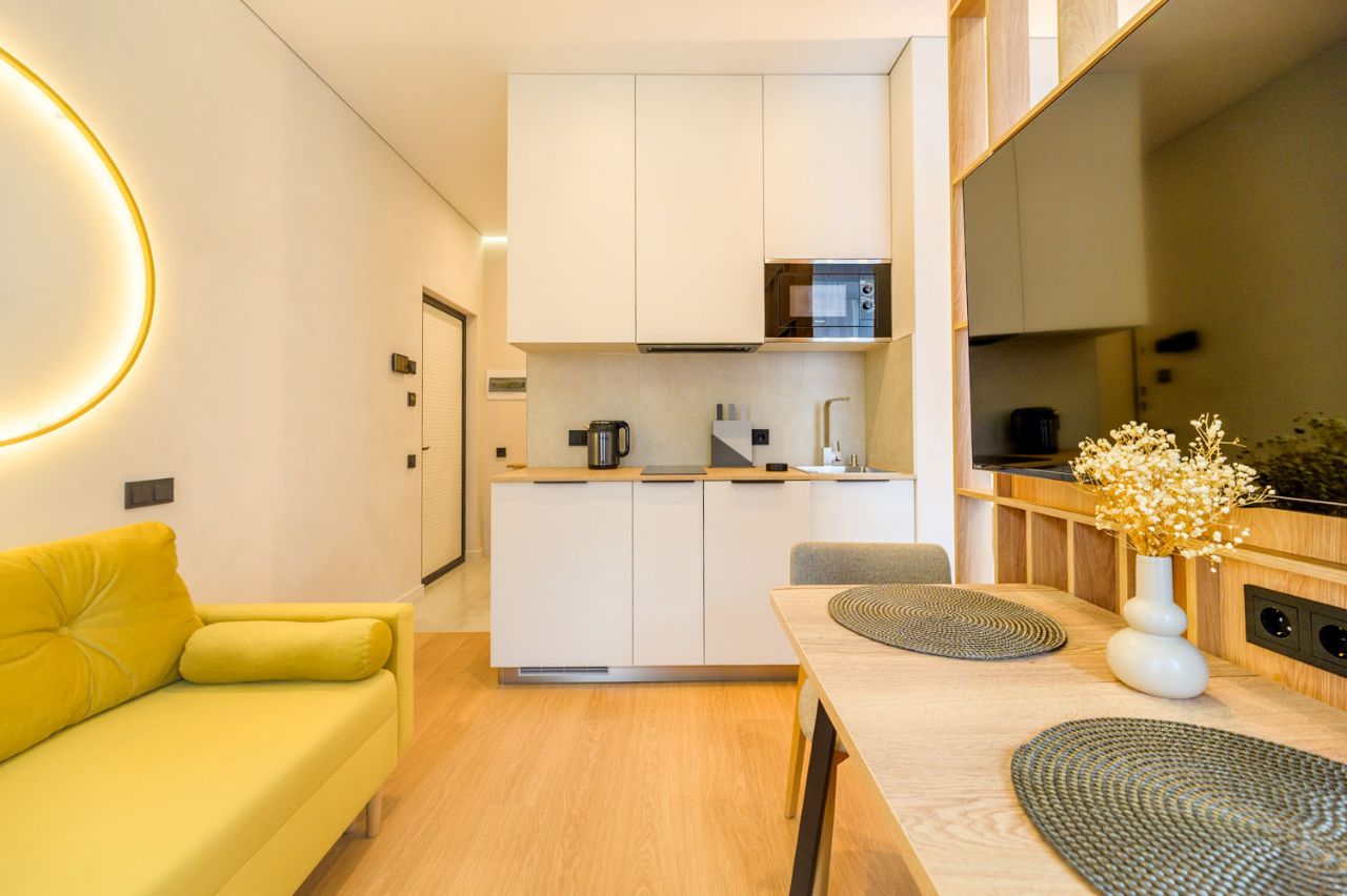 - зона гостиной со столиком, двухместным раскладывающимся диваном, телевизором с широкой диагональю, смарт-тв и wi-fi,