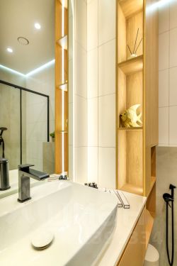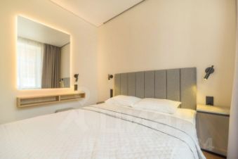 - спальная зона с точечным освещением и двуспальной кроватью с качественным матрасом, большим зеркалом и подвесной консолью для мелочей,