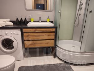 Санузел совмещенный. Душевая кабина, стиральная машина, фен, белоснежные полотенца, шампунь, гель для душа, бальзам для волос, зубные наборы.