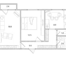 Кухня 8,9 м2, одна спальня 12.5 м2 и вторая 18.8 м2, санузел раздельный. Сдается с мебелью. Присутствует все необходимое: стиральная машина, духовка, холодильник, диван, кровать, шкафы для хранения и т.д.
