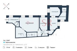 В планировку квартиры входит: светлая гостиная, совмещенная с кухней; две изолированные спальные комнаты; две ванные комнаты, одна с душевой кабиной, другая с гидромассажной ванной; отдельная постирочная комната; широкий коридор с зеркальными шкафами; также имеются небольшие отдельные комнаты для хранения вещей, одна из них может использоваться в качестве кабинета.