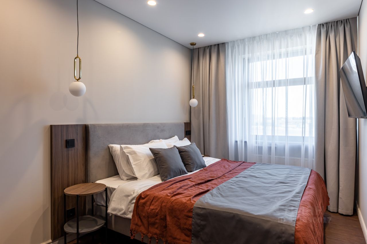 Большая кровать, удобный матрас, комфортный раскладной диван, рабочий стол, шторы блэкаут, большой шкаф для хранения вещей.
