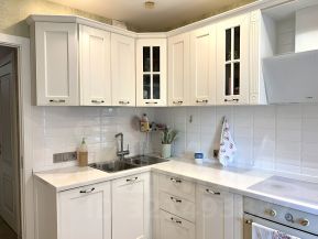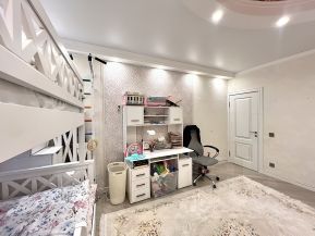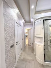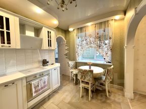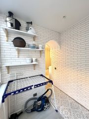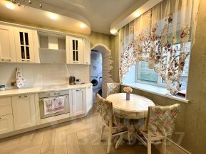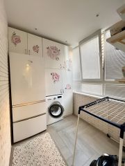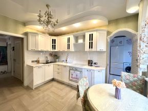 - Кухня оснащена электрической плитой с 4 конфорками, посудомоечной машиной и всеми необходимыми мелкими бытовыми приборами: стиральной машиной с функцией сушки, качественным пылесосом, утюгом, вытяжкой и чайником.