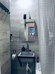 Мини-санузел совмещенный: с малой ванной 120x70, кухонная раковина, сушилка для белья.