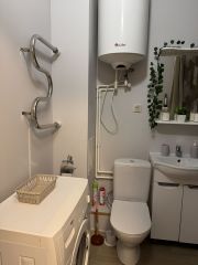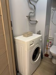 Большой санузел с удобной ванной, стиральная машина, фен, утюг, гладильная доска, сушилка.