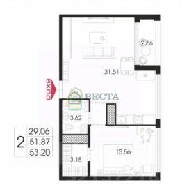 В долгосрочную аренду сдается 2евро квартира общей площадью 53,6 кв.м., зонированная кухня-гостиная 31,51 кв.м., спальная комната с просторной гардеробной 13,56 кв.м, совмещенный сан узел 3,62 кв.м, застекленная лоджия 2,66 кв.м.