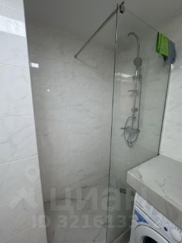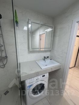 Санузел совмещённый, с новым оборудованием. Установлена душевая кабина, стиральная машина, полотенцесушитель, предусмотрено место для хранения бытовых мелочей. Все поверхности легко содержать в чистоте, ремонт выполнен в нейтральных тонах.