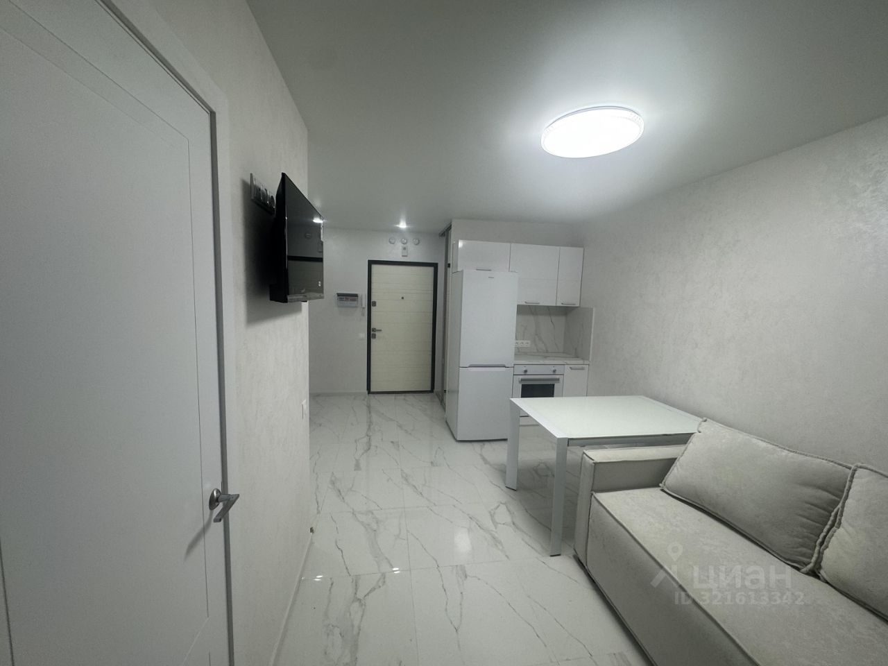 Кухня полностью укомплектована современной техникой: холодильник, варочная поверхность, духовой шкаф, вытяжка, посудомойка, микроволновка, чайник. В кухне-гостиной установлена мягкая мебель и телевизор, что делает её полноценной зоной отдыха.