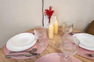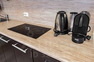 - Кухонный гарнитур с варочной поверхностью, холодильником, микроволновкой, чайником, кофемашиной, набором посуды для готовки и сервировки