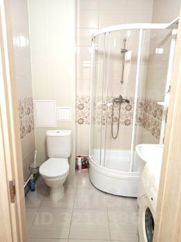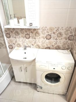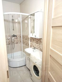 Просторная ванная  комната с душевой кабиной и стиральной машиной.