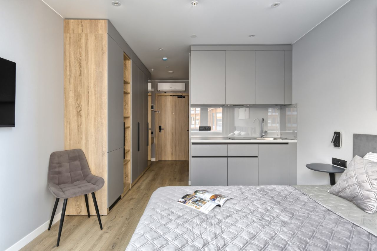В студии продумано всё до мелочей: стильный интерьер, современная мебель, продуманы места для хранения. Из техники есть всё необходимое для комфортного проживания: кондиционер, холодильник, микроволновая печь, индукционная плита, телевизор, посудомоечная и стиральная машины, утюг, высокоскоростной интернет Wi-Fi. Ванная комната оснащена душевой кабиной. Окна выходят во двор, поэтому в квартире всегда тихо и уютно.