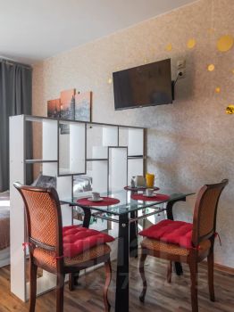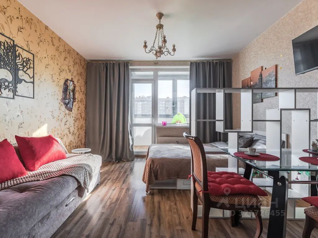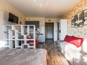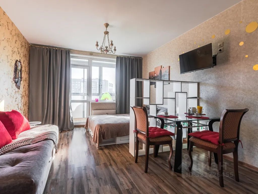 Квартира- студия расположена в центре кудрово. Ближайшая станция метро улица дыбенко. Пешком до метрополитена около 20 минут, либо на автобусе в пяти минутах остановка. Окна во двор. В квартире имеется все необходимое: электроплита, чайник, микроволновка, холодильник, электрическая турка для кофе. Постельное бельё, полотенца, одноразовые гели для душа, фен, утюг, стиральная машина. Два основных спальных места, двухспальная кровать+ одно место дополнительно: диван (ширина односпальной кровати).