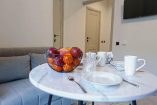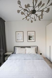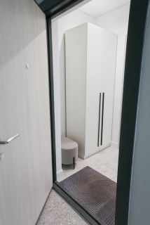 В квартире есть все необходимое для комфортного проживания: в спальне кровать с удобным матрасом, телевизор, шкаф, в кухне раскладывающийся диван, стол со стульями, кухонный гарнитур, холодильник, варочная поверхность, духовой шкаф, также есть посуда для приготовления пищи и сервировки. В ванной комнате душевая кабинка, бойлер, стиральная машина, фен. В прихожей еще один шкаф и пуфик.