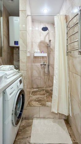 • Ванная комната с душем, стиральная машина, фен и средствами гигиены