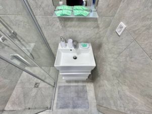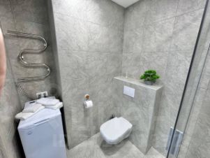 — Ванная комната с душевой кабиной, стиральной машиной, феном.