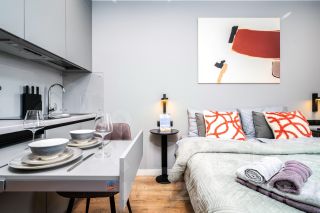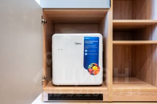 В кухонной зоне: микроволновая печь, холодильник, варочная панель, чайник, посуда и столовые приборы.
